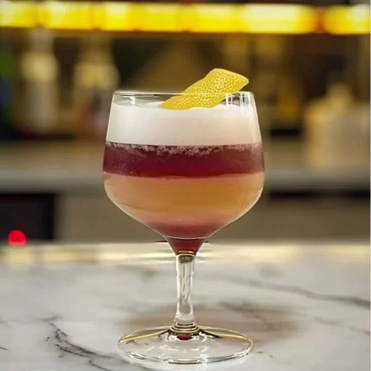 As you finish the sip, the red wine makes a striking appearance, adding depth and a slight tartness that balances the sweetness from the orgeat syrup. The wine’s tannins complement the bourbon’s oakiness, leaving a lingering, satisfying finish that invites you to take another sip.