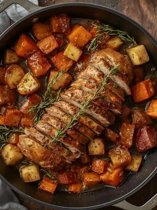 This is a complete fall pork tenderloin recipes meal in one pan. The pork is tender and flavorful. Root vegetables are soft and caramelized. The sauce is made from apple cider. Everything cooks together beautifully. It’s hearty, delicious, and fall perfection.