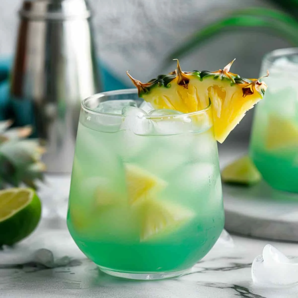The Mermaid Water Cocktail offers a balanced blend of tropical flavors. The blue curacao provides a sweet orange flavor, while the coconut rum adds a creamy coconut taste. The spiced rum gives a warm, slightly spicy kick, and the fresh lime juice adds a tangy freshness. Topped with pineapple juice, this cocktail is sweet, tangy, and refreshing, making it perfect for a sunny day.