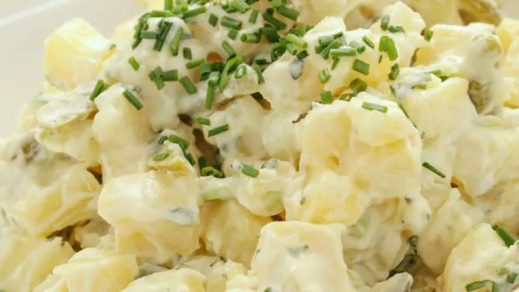 A slightly healthier twist, this salad swaps mayo for Greek yogurt. Add red potatoes, lemon juice, dill, and chopped cucumbers for a tangy, refreshing spin. It’s creamy but lighter, and the flavor is clean and zippy.