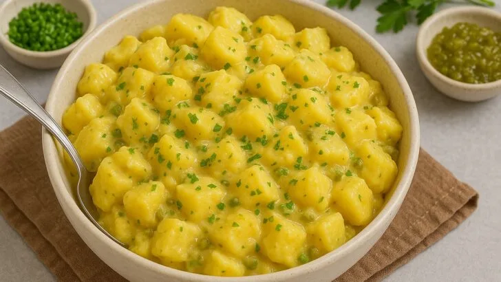 This one’s the backyard BBQ hero. It’s made with boiled Yukon Gold potatoes, chopped celery, hard-boiled eggs, mayo, yellow mustard, and a dash of sweet pickle relish. Creamy and a little tangy with that satisfying crunch, it looks as comforting as it tastes—pale yellow with bits of green and white peeking through.
