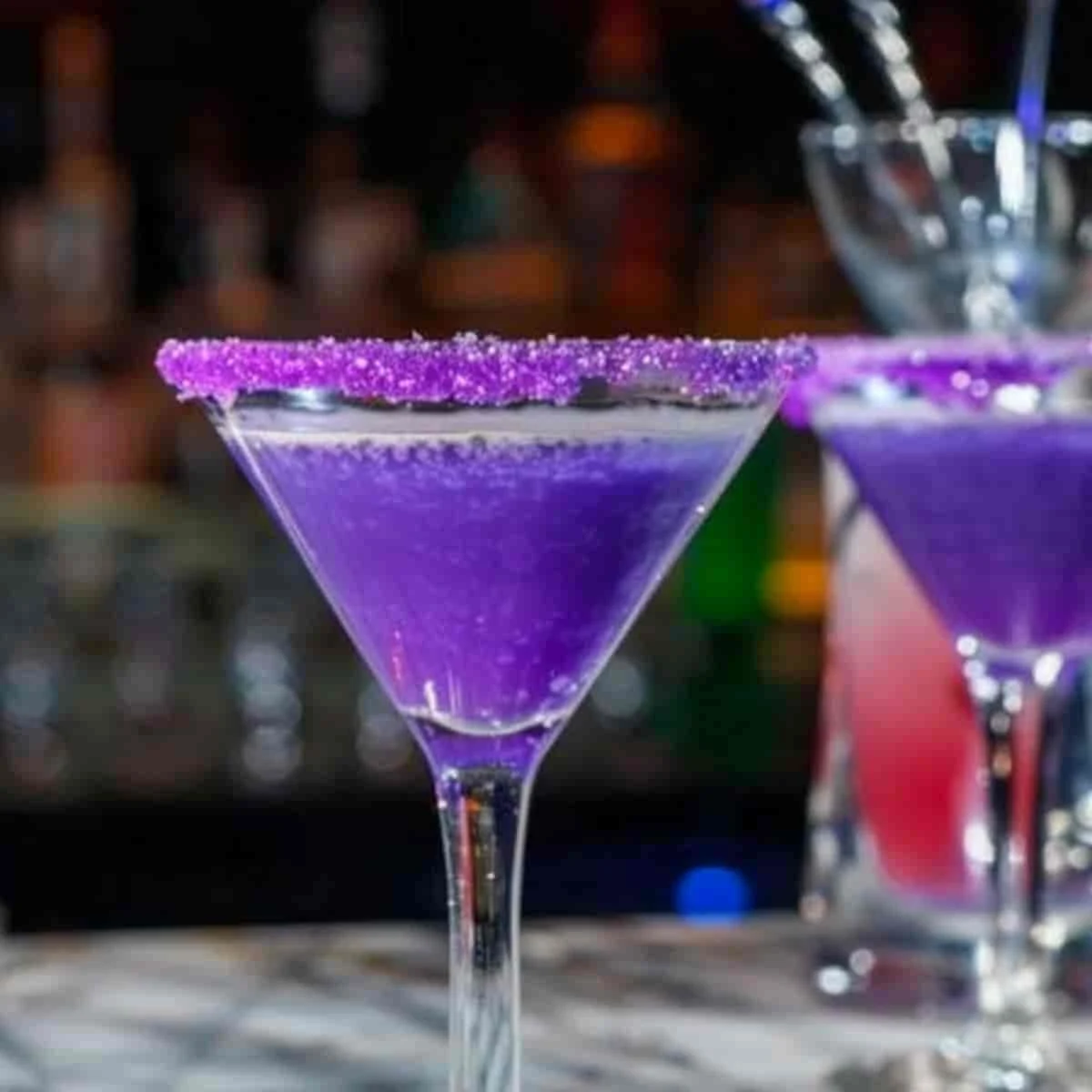 - If you're doing the sugar rim, rub the glass rim with lime then dip it in the purple sugar. Set aside.