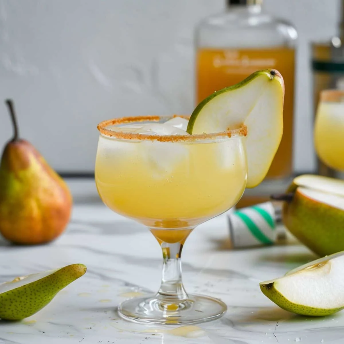 The Vanilla Pear Margarita is a unique twist on the classic margarita, combining the smooth flavors of tequila and vanilla vodka with the sweet and fruity taste of pear nectar, balanced by a touch of lemon juice and simple syrup. The drink is served with a cinnamon-sugar rim for a hint of spice and added sweetness.